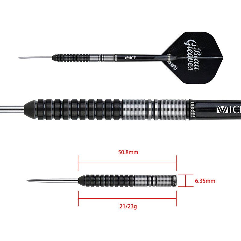 Constructed from a Very High Density Tungsten (90%), these darts feature a shorter barrel and a striking black finish. The classic straight barrel design, enriched with meticulous ring cuts and micro grips, ensures each throw is a masterpiece of precision and control.