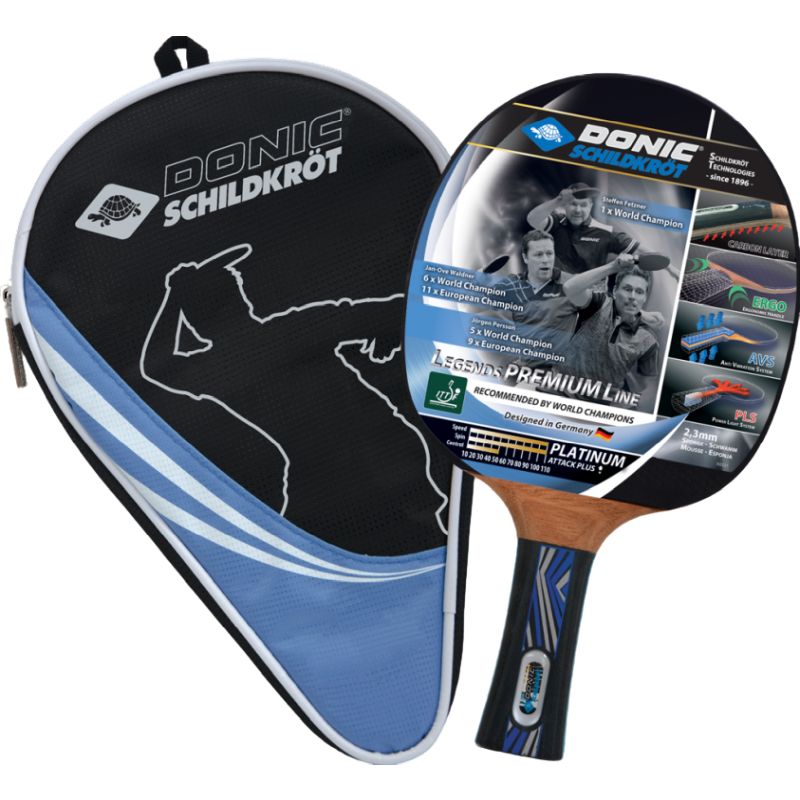 Donic Legends Platinum bat is a competition quality bat. Legends Platinum is a ITTF approved bat and features, 5CC Carbon insert blade, 2.3mm competition sponge, Liga rubbers, Concave handle with ERGO design, AVS and PLS Power Light System. This Special series also comes with it very own Legends bat cover.